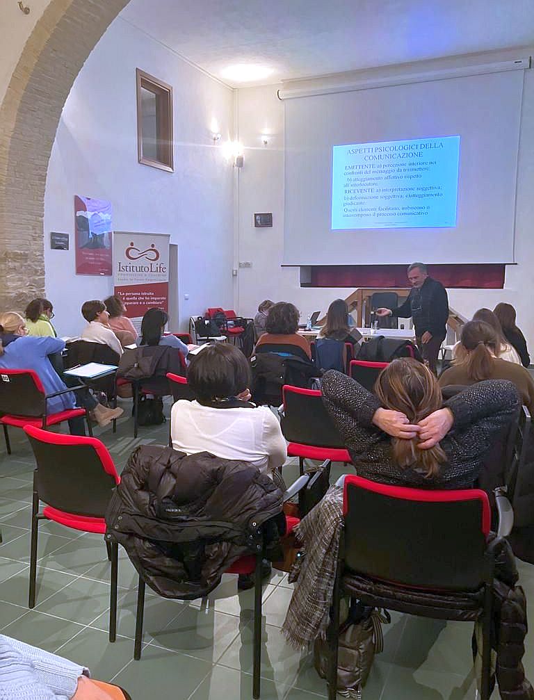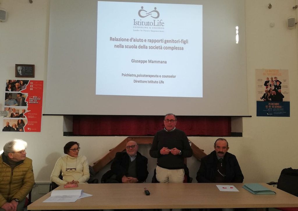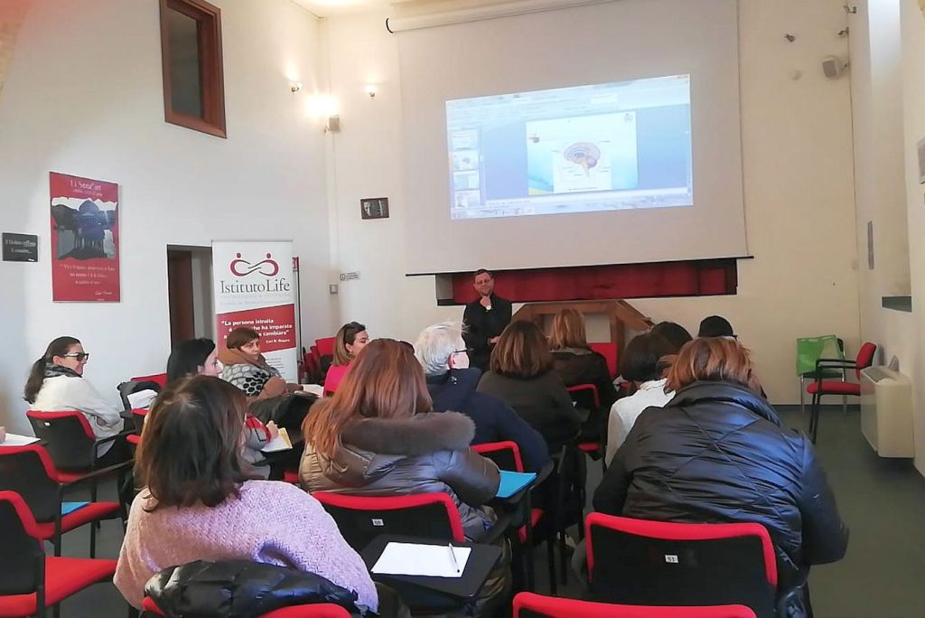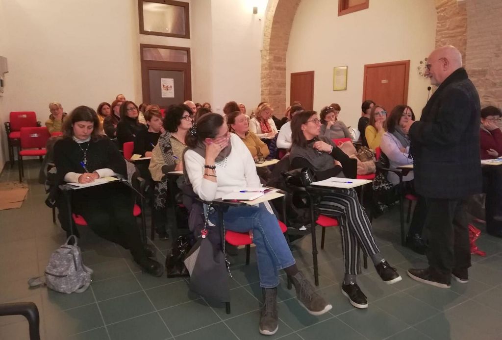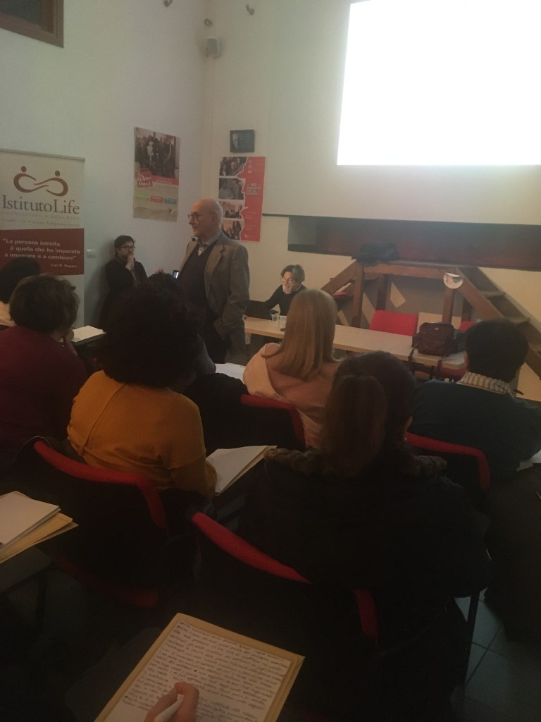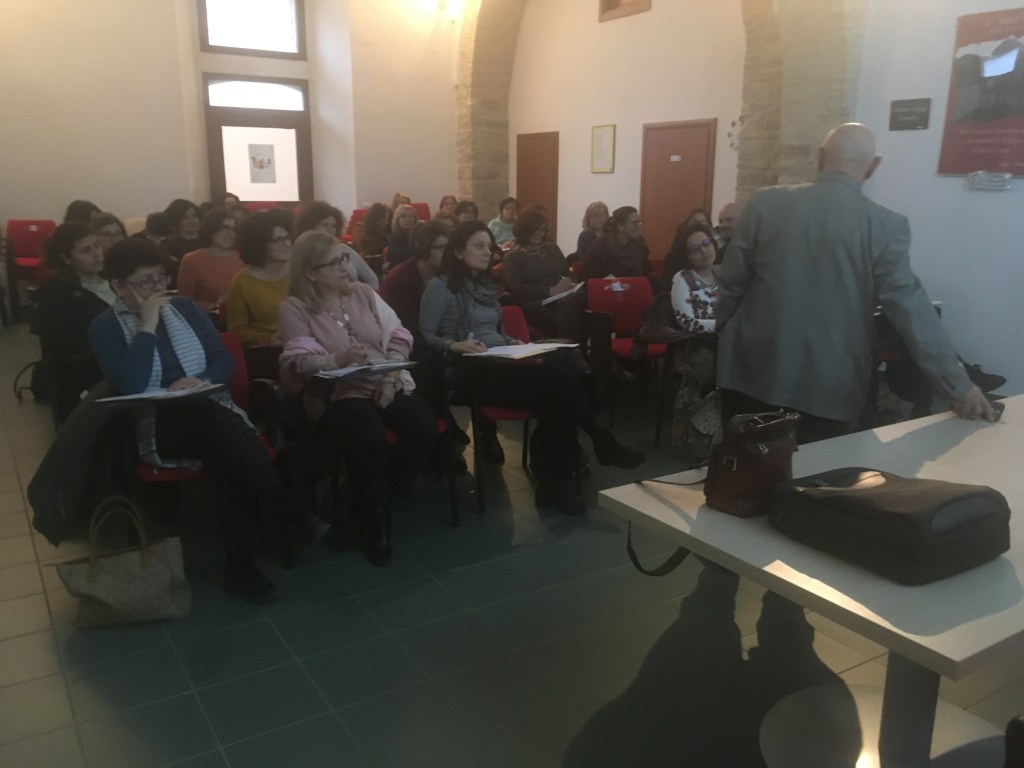 ‘Relazione d’aiuto e rapporti genitori/figli nella scuola della società complessa’, seconda giornata di formazione; in aula, il dottor Luigi de Michele, psicoterapeuta e conduttore di gruppo