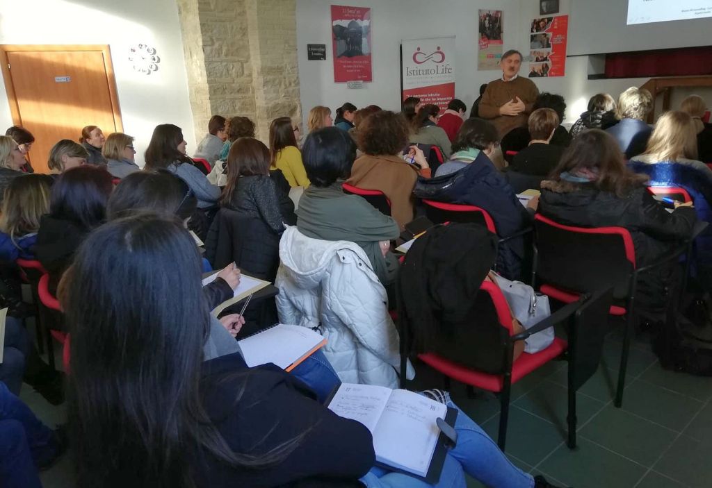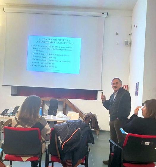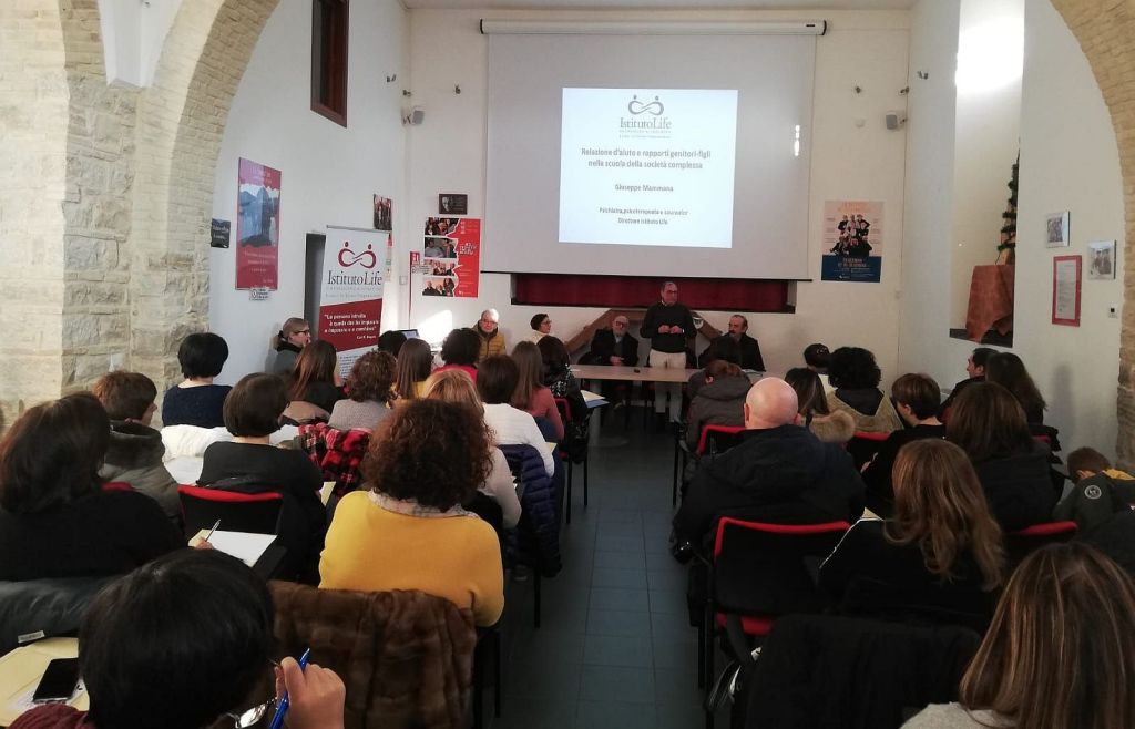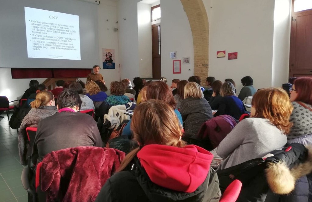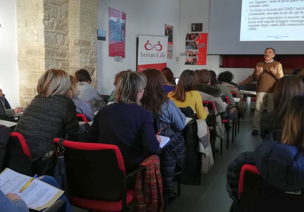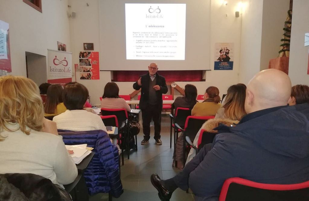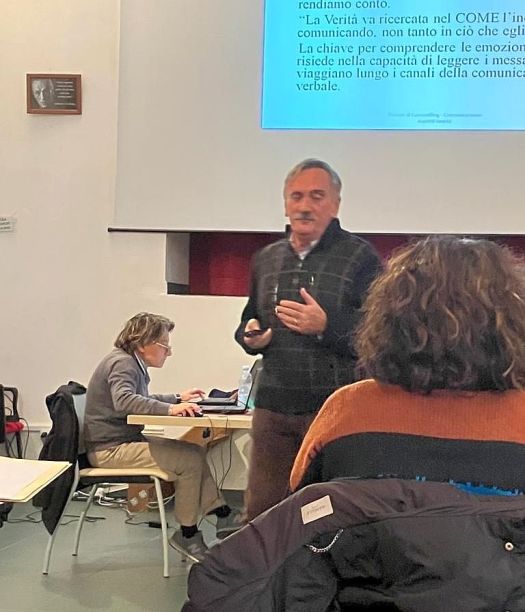 ‘Relazione d’aiuto e rapporti genitori/figli nella scuola della società complessa’, seconda giornata di formazione; in aula, il dottor Luigi de Michele, psicoterapeuta e conduttore di gruppo