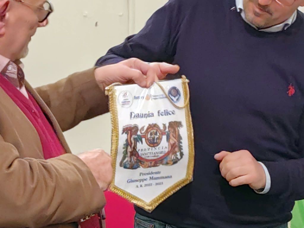 Durante la consegna degli attestati ai partecipanti, il dottor Giuseppe Mammana ha donato lo stemma del presidente del Rotary Club Foggia alla nostra Fondazione, nonché al Comune di Castelluccio Valmaggiore, che nella persona dell’assessore alla Cultura, Angelo Pompa, ha altresì fatto dono al presidente del Rotary Club Foggia di una litografia del Comune, realizzata dall’artista castelluccese Savino Coppolella.